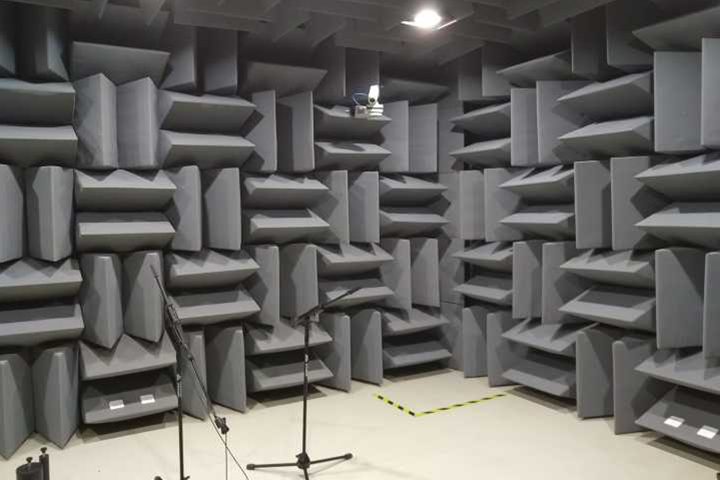 首先,六个墙面布满了高吸声系数的吸声尖劈,对消声起了决定性作用。在我们日常生活中,声音都是经过无数次反射,才传达到人耳。而吸声尖劈作为一种特殊的吸声体,能对声音起到很好的吸收作用,屏蔽反射声的影响,让测试仪器可以捕捉到最真实的声音。